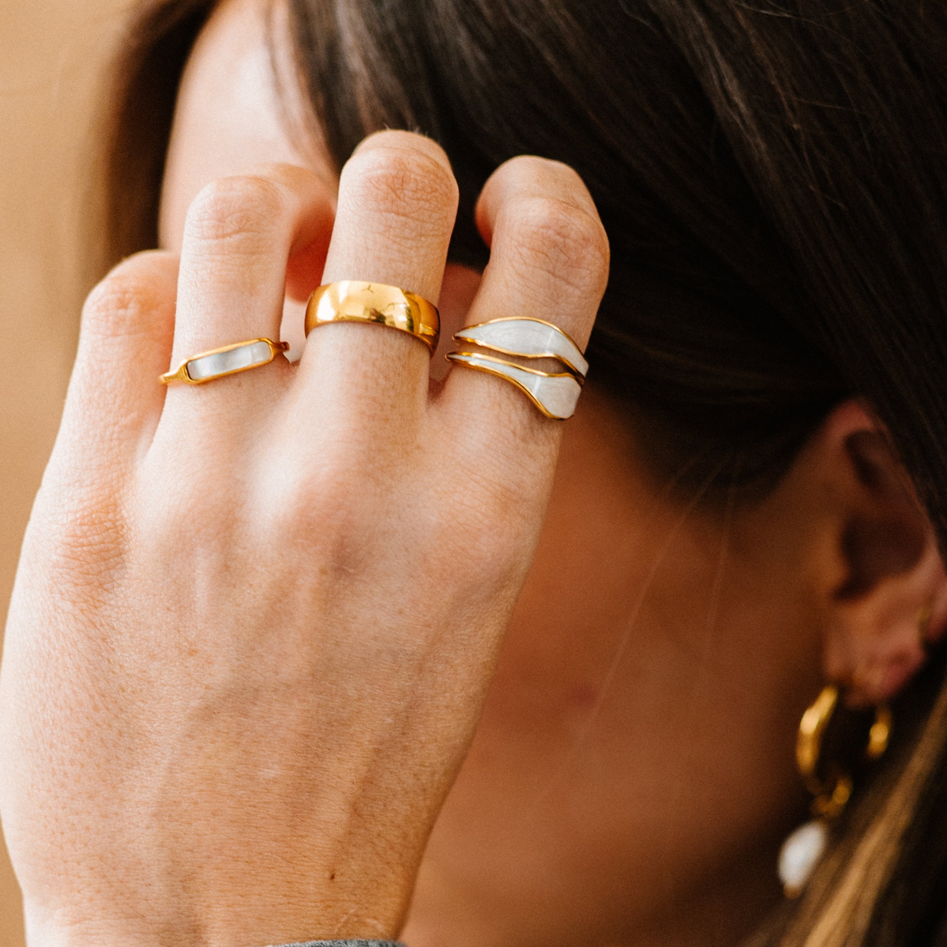 The Cloud ring a is a showstopper. The perfect stand out piece to complete any jewelry stack, the cloud ring features organic wavy lines filled with mother of pearl. We have a feeling you'll be reaching for this ring every. single. day.